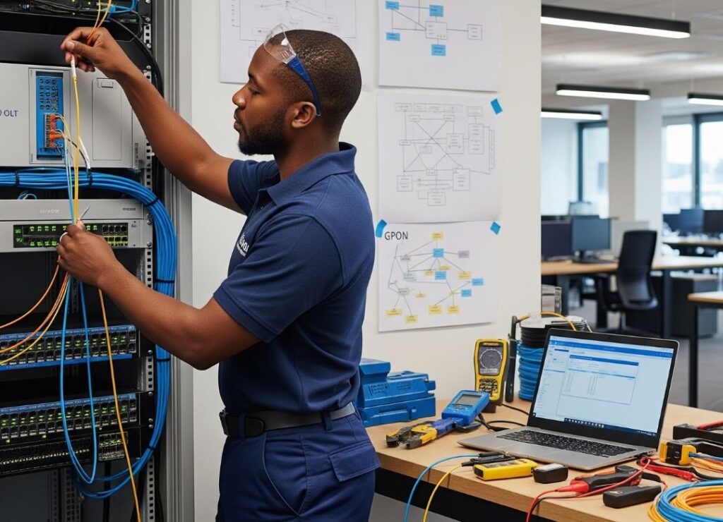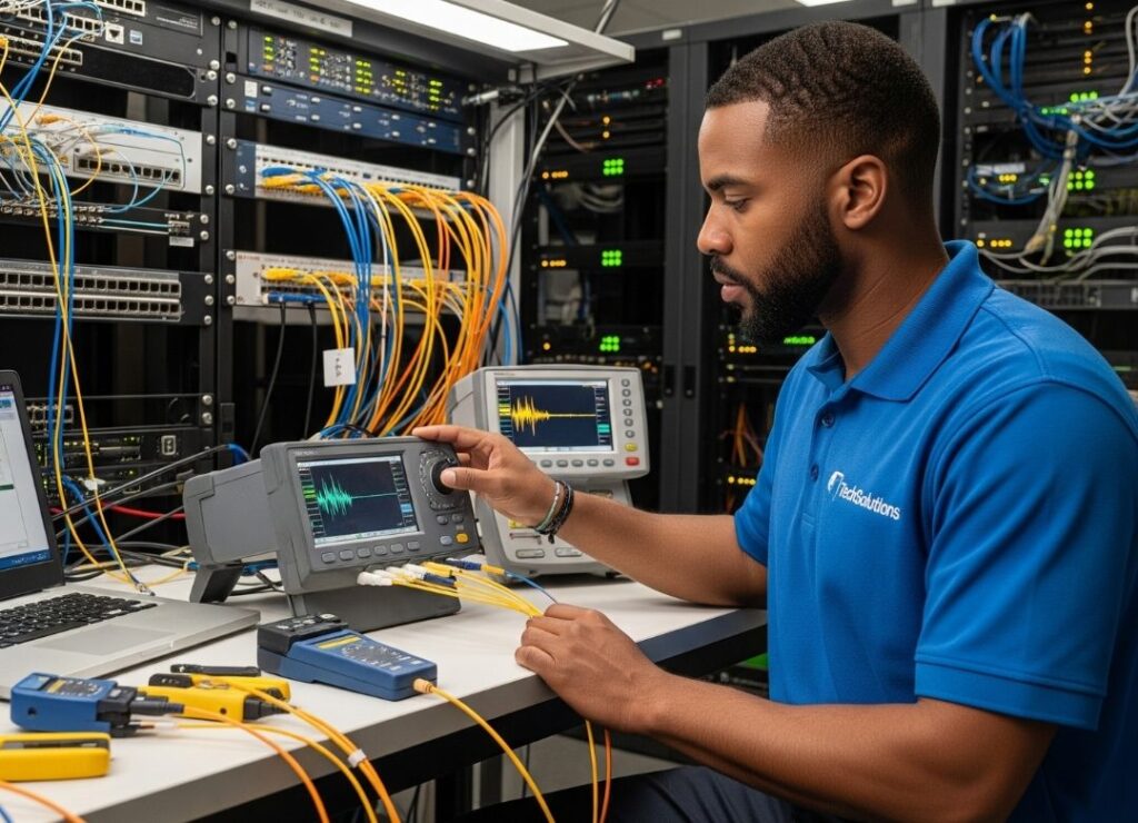 Projetamos e instalamos redes de fibra óptica de alta capacidade, incluindo emendas, testes e análise OTDR (Optical Time-Domain Reflectometer), garantindo conectividade confiável e de longo alcance.